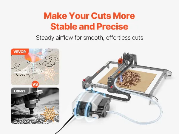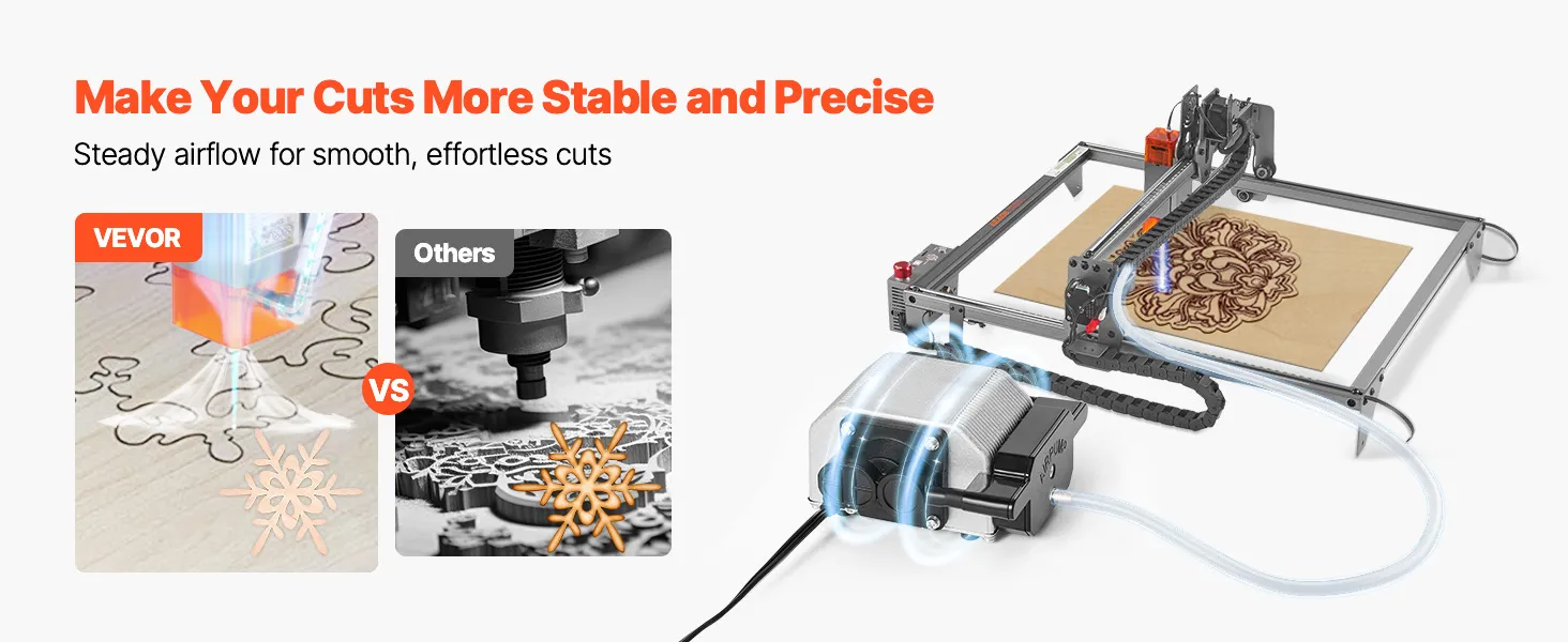 Safeguard Your Laser Module: Our optimized air assist pump is designed to blow away smoke and debris, keep the module clean, extend service life, and ensure your equipment stays stable for efficiency, an exact choice for precision cutting. Unlock faster, deeper cuts.