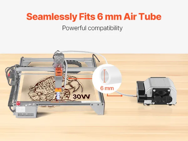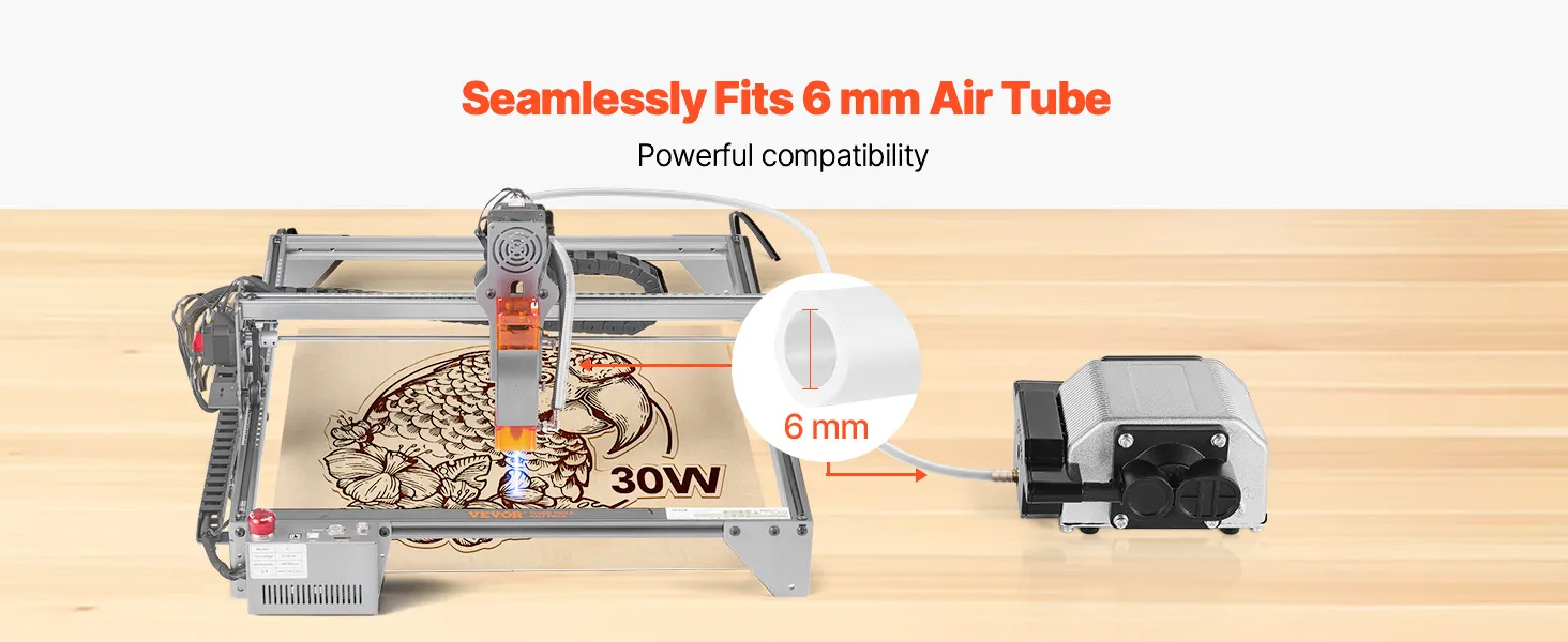 Our air assist for laser cutter has powerful compatibility ensures a secure connection with 6mm air tube, providing consistent airflow to tackle a range of laser cutting and engraving tasks.