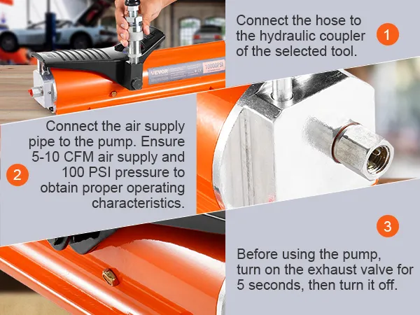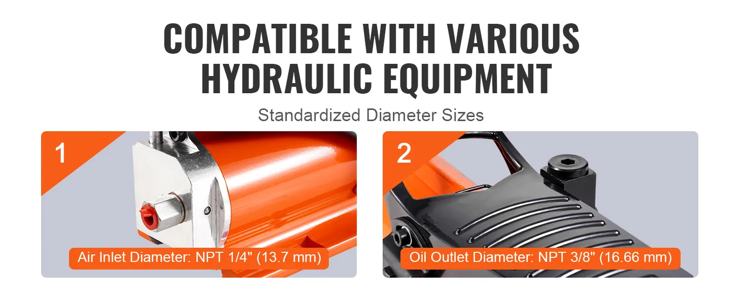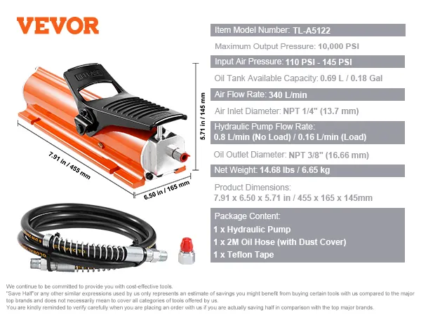 Hoge prestaties van 10.000 PSI: Bereik een hydraulische druk tot 10.000 PSI met een luchtstroom van 340 l/min. Deze hydraulische luchtpomp biedt een debiet van 0,8 l/min (stationair) en 0,16 l/min (belasting), waardoor hij ideaal is voor zware klussen zoals heffen, persen, buigen, rechttrekken, snijden, monteren en demonteren.