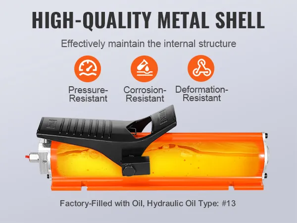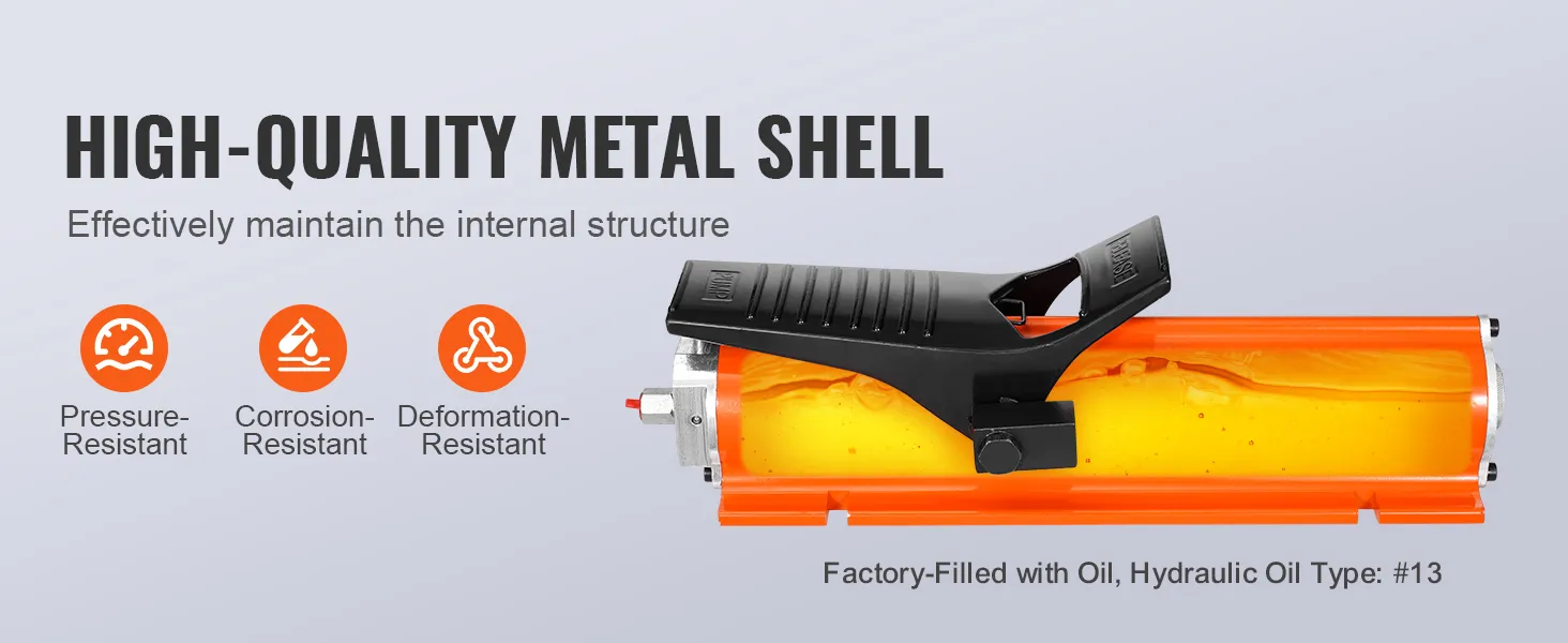 De robuuste buitenbehuizing van de hydraulische voetpomp beschermt de interne componenten optimaal. In de fabriek gevuld met hydraulische olie (#13), zorgt dit voor een efficiënte, veilige en langdurige hydraulische werking.