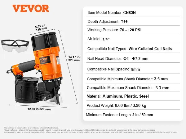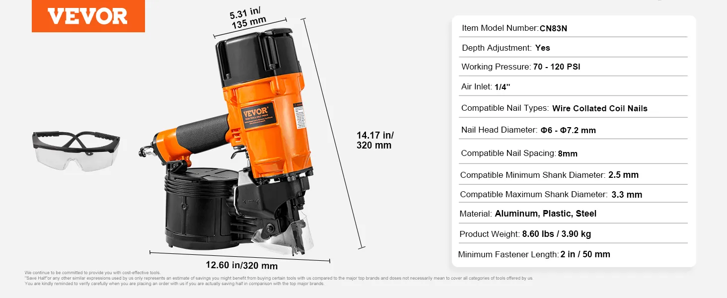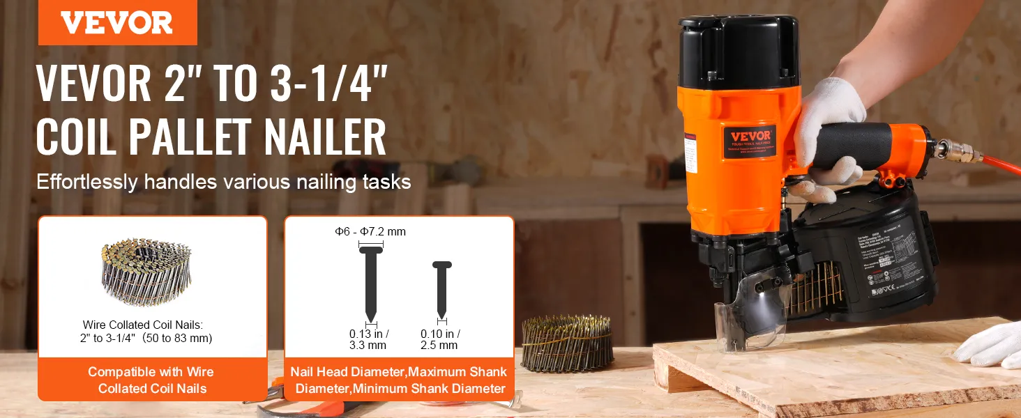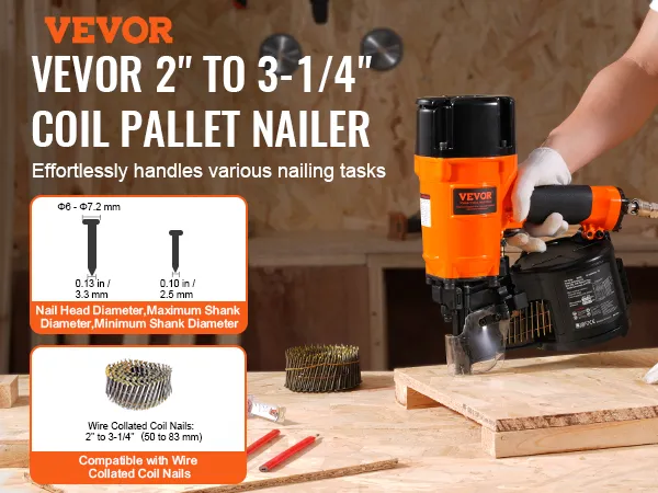 • Exceptional Performance: VEVOR CN83N pneumatic coil nailer is compatible with wire-collated coil nails, accommodating lengths from 2" to 3-1/4" and head diameters from Φ6 to Φ7.2 mm. It is ideal for assembling pallets, wooden boxes, fencing, and handling general construction tasks like siding, decking, and sheathing. (Compatible Shank Diameter: Min 2.5 mm - Max 3.3 mm)