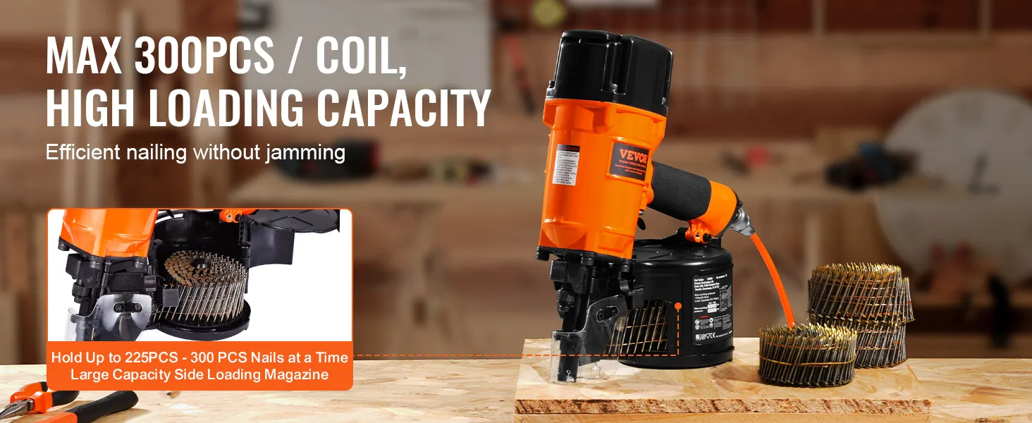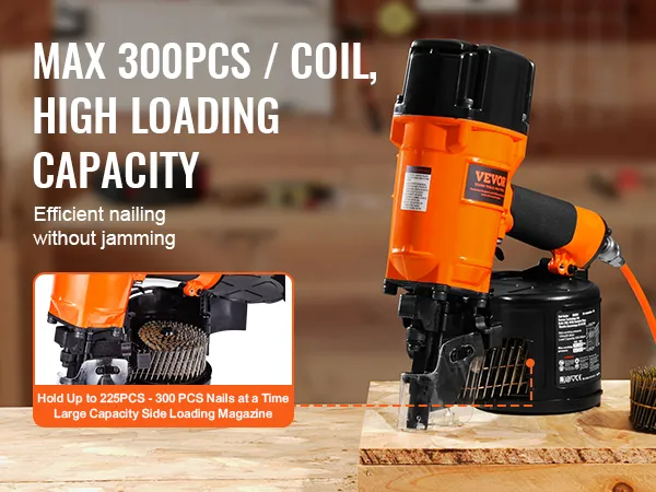 Equipped with a large-capacity side-loading magazine, this air coil nailer holds up to 225-300 nails at once. This high loading capacity allows for prolonged, efficient operation, minimizing the need for frequent reloading and keeping your work flow uninterrupted.