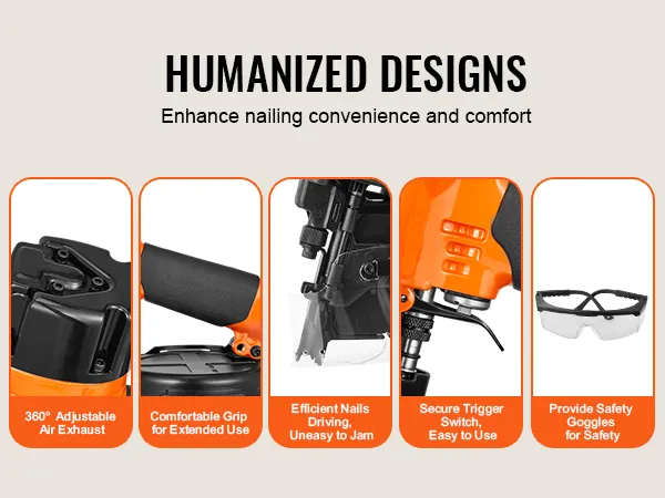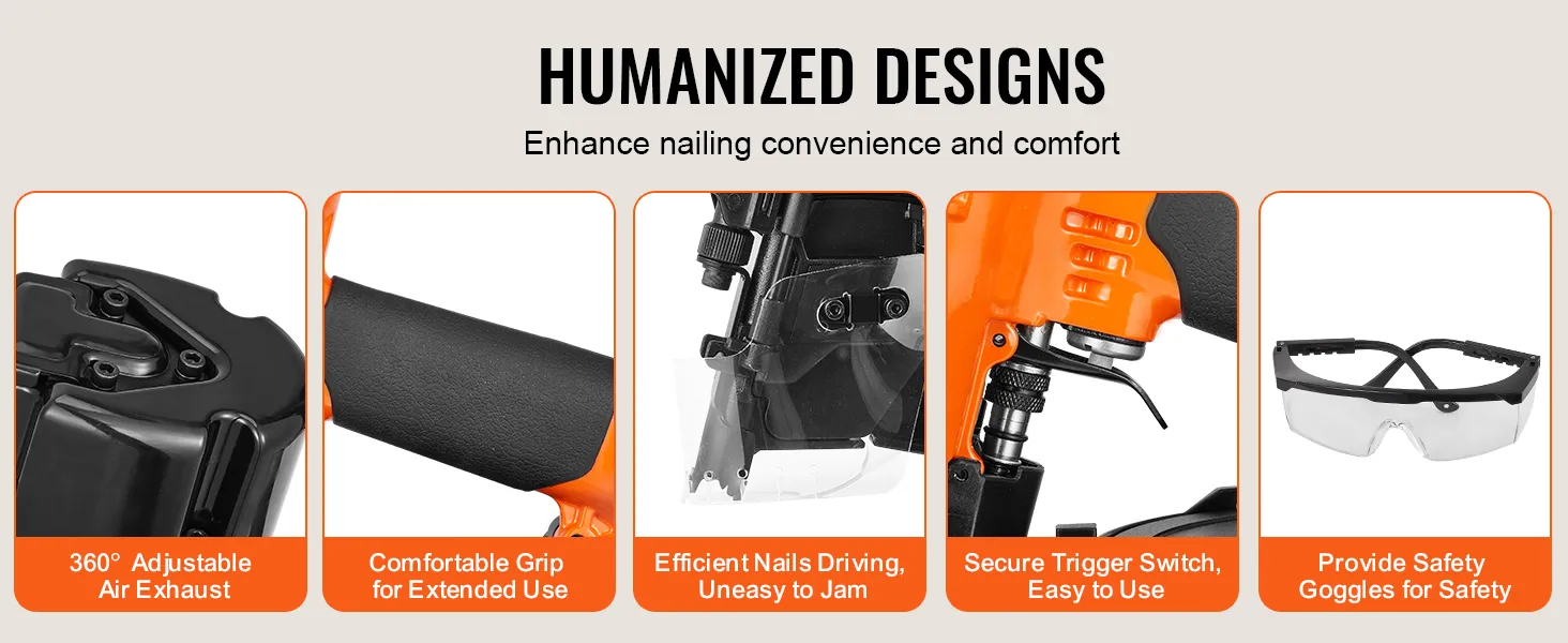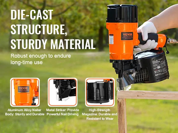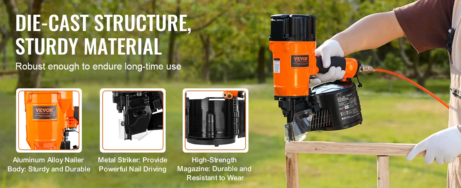 The coil nailer is compact and lightweight, featuring an ergonomic body and anti-slip handle grip that reduce hand fatigue. Its sturdy construction ensures long-term durability and reliable performance, making it ideal for demanding tasks.