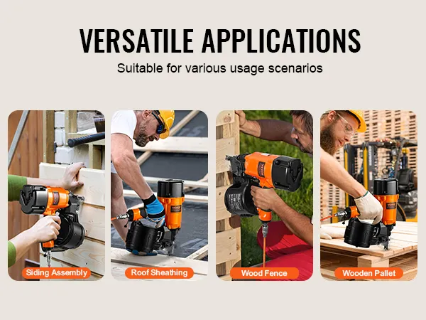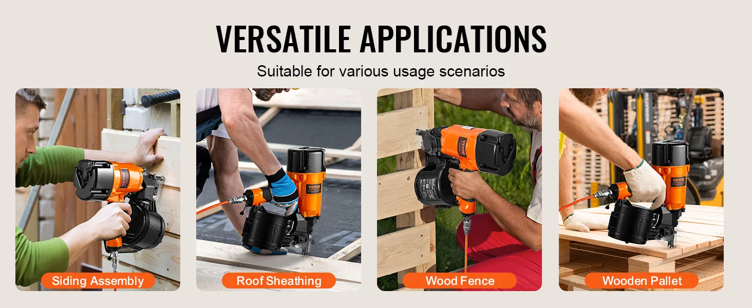 The VEVOR CN83N pneumatic coil nailer is compatible with wire-collated coil nails, accommodating lengths from 2" to 3-1/4". It is perfectly suited for home improvement and repair tasks, excelling in a wide range of applications including siding, sheathing, woodworking, fencing, and decking.