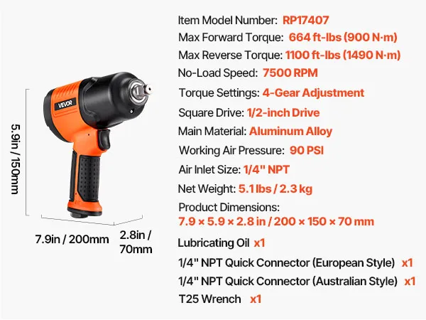 Breed scala aan toepassingen: De VEVOR 12,7 mm (1/2 inch) luchtslagsleutel is krachtig genoeg om bouten en moeren los te draaien, ideaal voor lichte autoreparaties of reparaties en onderhoud aan huis; luchtverbruik: 6,3 CFM, werkdruk: 90 PSI, luchtinlaat: 1/4 inch (6,35 mm) NPT