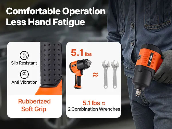 Lichtgewicht en compact: deze 12,7 mm (1/2 inch) pneumatische slagmoersleutel heeft een lichtgewicht behuizing en een ergonomische, rubberen handgreep voor maximaal comfort en antislipcontrole. Vermindert trillingen en handvermoeidheid bij langdurig gebruik.