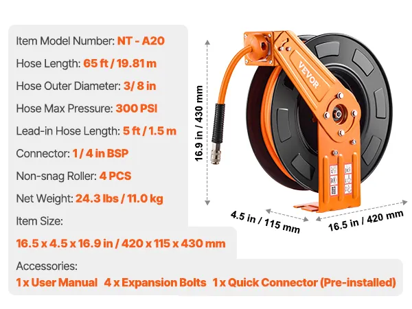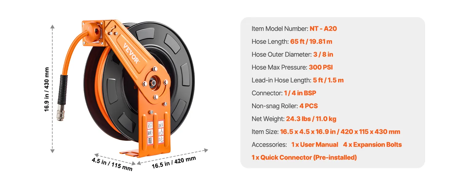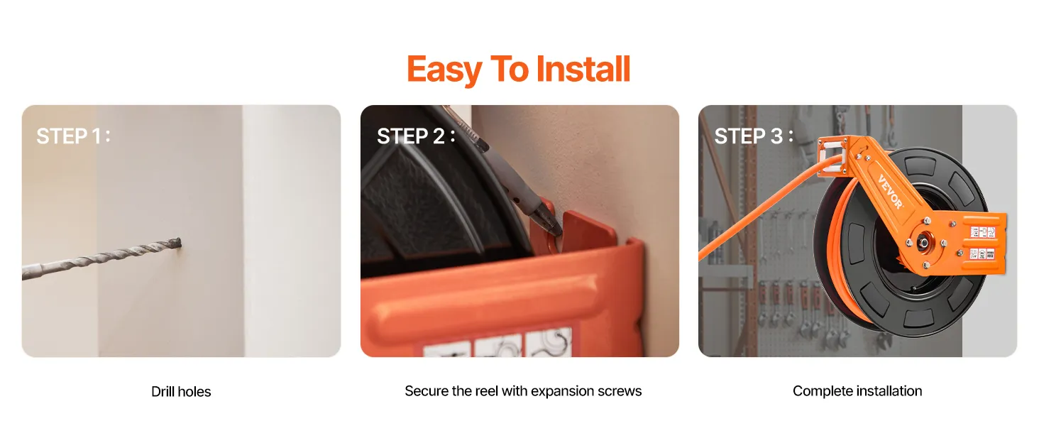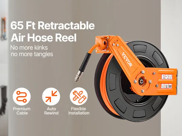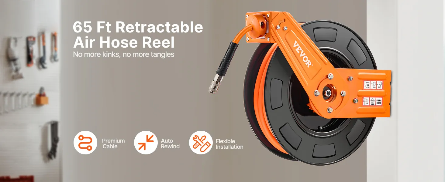 VEVOR air compressor hose reel plays an important role in the workshop. Whether it is a car DIY tool room, a repair workshop, a machining workshop or other industrial workshops, it can provide you with a neat and orderly working environment.