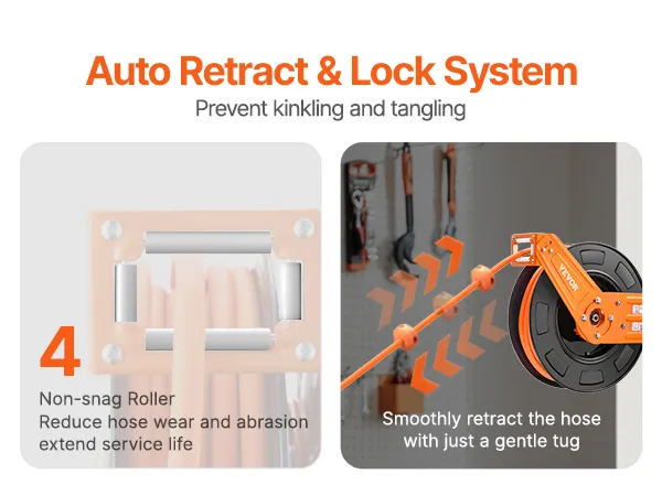 The VEVOR auto-rewind air hose reel makes it easy to use your hose without kinks or tangles. With a simple, gentle tug, the hose retracts smoothly and effortlessly. 4 non-snag rollers help reduce hose wear and abrasion, significantly extending the service life.