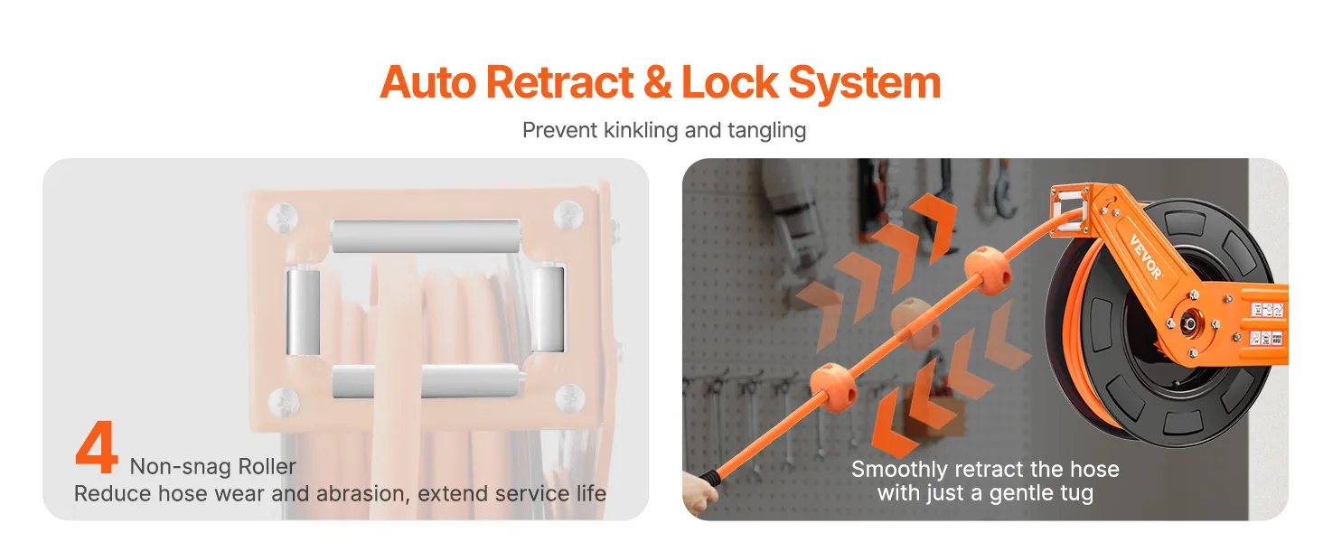 Automatic Rewind: Our auto-rewind retractable air hose reel eliminates the need for manual winding and prevents twisting or tangling. It includes 4 non-slip rollers to reduce wear and tear on the hose. And you can adjust the stopper to lock the hose at your desired length, providing convenience and ease of use.