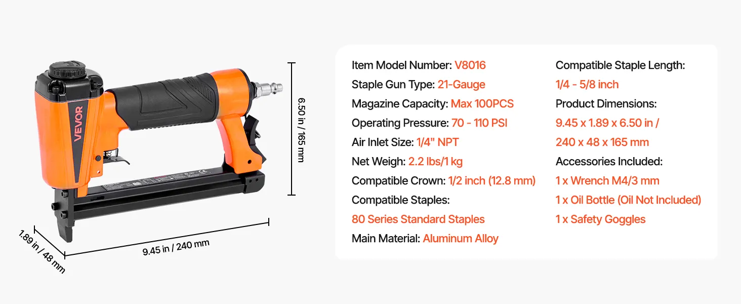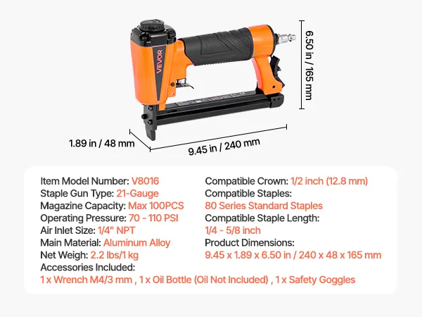 Compatibele nieten: Deze pneumatische spijkermachine van 21 gauge is compatibel met standaard nieten uit de 80-serie met een kroon van 12,8 mm en nieten met een lengte van 6 tot 16 mm. Bedrijfsdruk: 70-110 PSI, luchtinlaat: 1/4-inch NPT. Voor gebruik moet de machine worden aangesloten op een luchtcompressor (luchtcompressor niet inbegrepen).