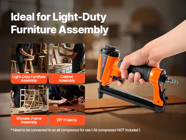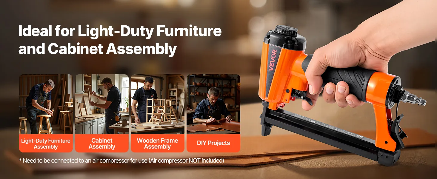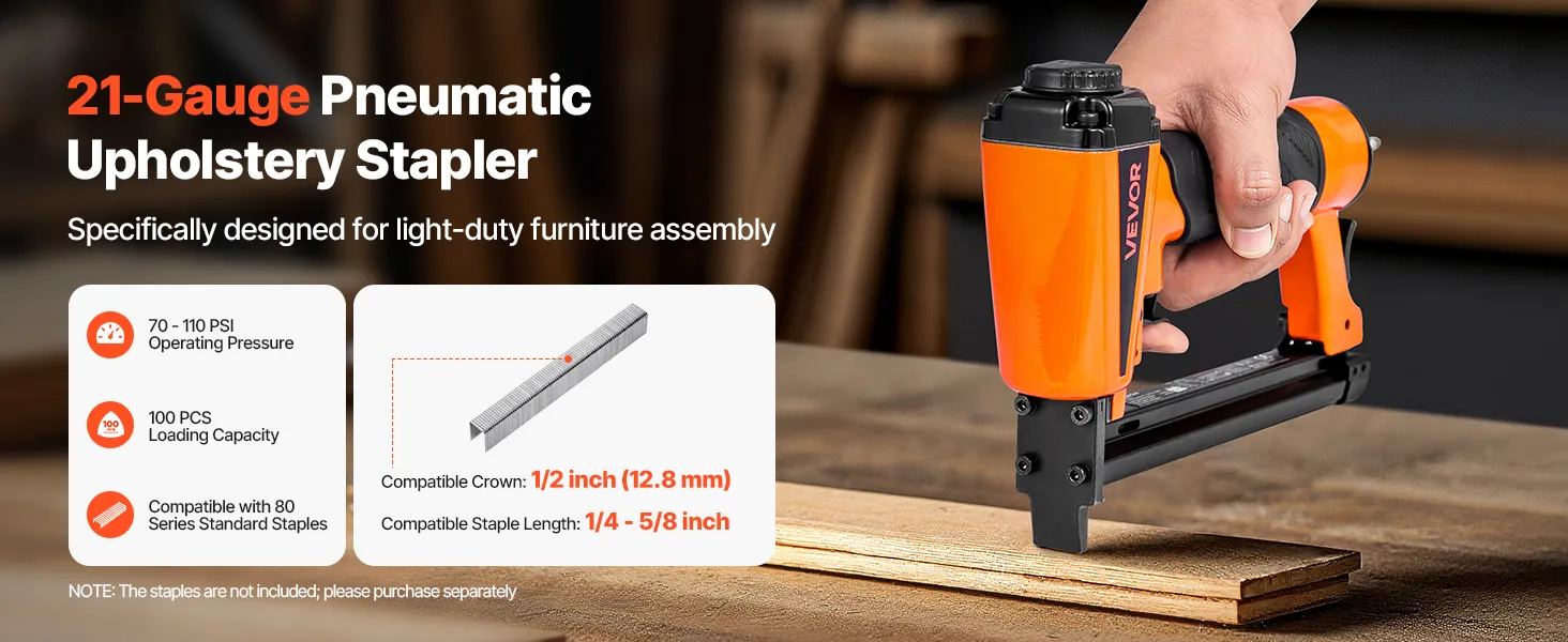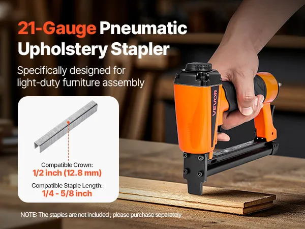 Veelzijdig gebruik: onze pneumatische meubelnietmachine van 21 gauge is ideaal voor meubelbekleding, houtbewerking, het bevestigen van bankhoezen, het monteren van lichte meubels, het installeren van houten frames, het bevestigen van decoratieve lijsten, het inlijsten van schilderijen en andere doe-het-zelfprojecten.