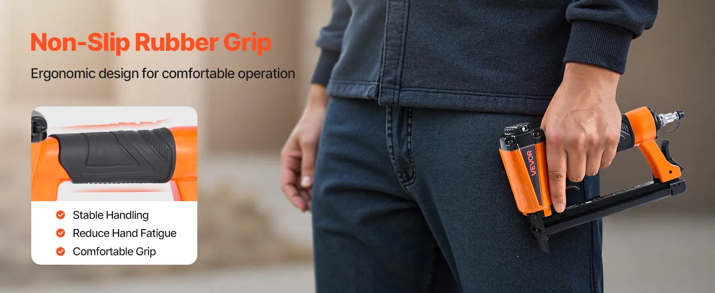 Comfortabele grip: Deze lichte pneumatische nietmachine is uitgerust met een ergonomische, antislip rubberen handgreep en een lichtgewicht constructie. Hij biedt betere controle en een zachte en veilige grip, waardoor de hand minder snel vermoeid raakt bij langdurig gebruik.