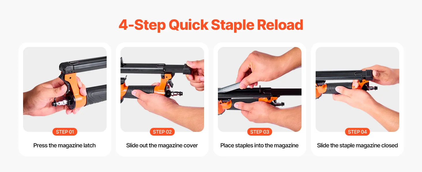 Hoge laadcapaciteit: onze pneumatische nietmachine beschikt over een magazijn met een grote capaciteit dat tot 100 nietjes tegelijk kan bevatten. Dit zorgt voor efficiënt werken zonder vaak bijvullen. (Nietjes zijn niet inbegrepen; deze kunt u apart aanschaffen.)