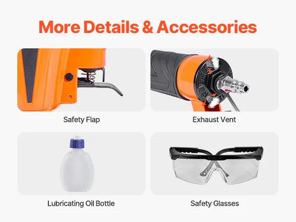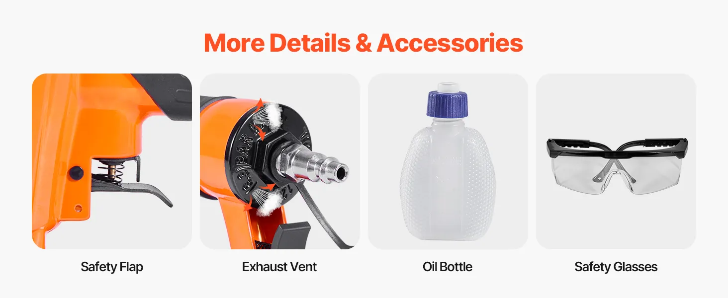 Ons pneumatische meubelstoffeerpistool is voorzien van een veiligheidssluiter, een roterend uitlaatontwerp om de lucht van de gebruiker weg te leiden en een veiligheidsbril om uw ogen te beschermen tijdens het gebruik.