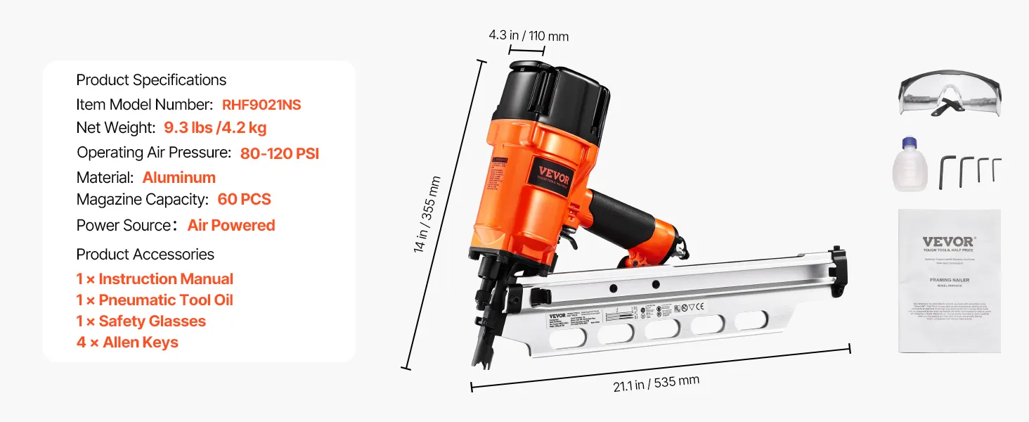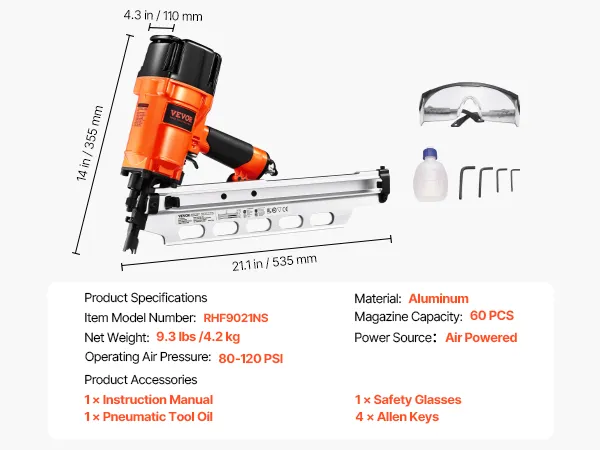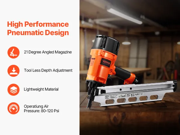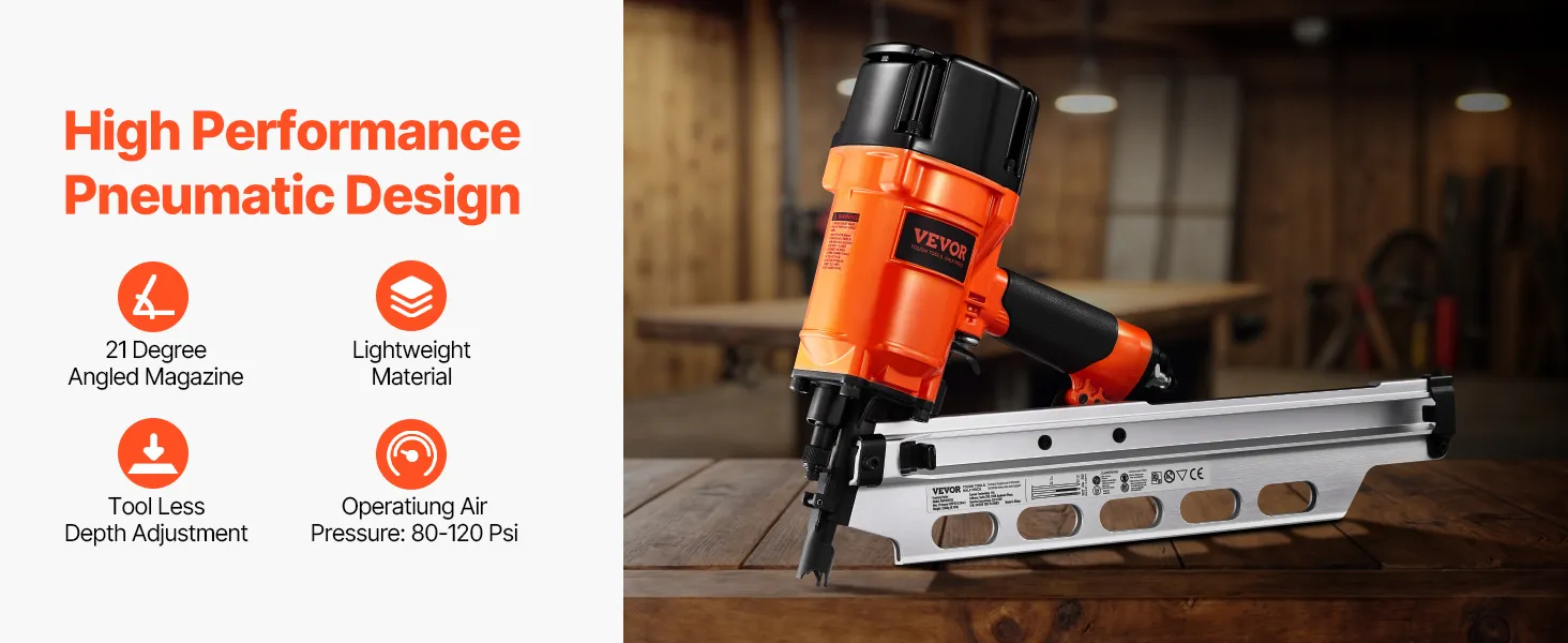VEVOR Luchtspijkerpistool, 50 tot 90 mm, ronde kop van 21 graden, pneumatisch spijkerpistool met twee trekkerstanden en diepteverstelling, 80-120 PSI Pro pneumatisch spijkerpistool voor framebouw, vloeren en vlonders