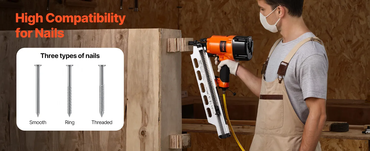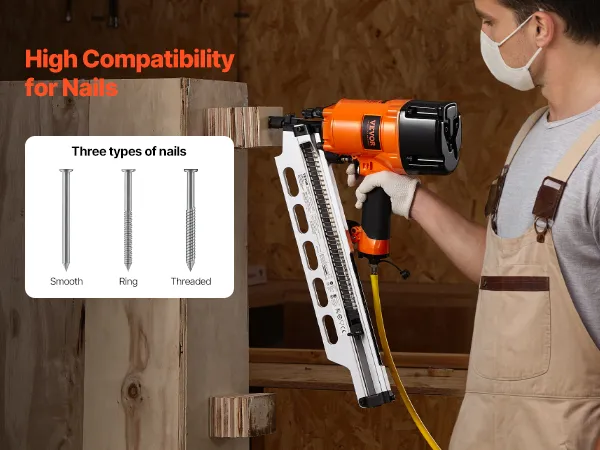 Hoge compatibiliteit: Deze 21° ronde kopspijkermachine is compatibel met 3 soorten nagels: nagels met gladde schacht, nagels met ringschacht en nagels met schroefdraad, en voldoet daarmee aan verschillende bouwbehoeften. Spijkers met gladde schacht: lengte: 50–90 mm, diameter: 2,87–3,302 mm; Spijkers met ringvormige schacht: lengte: 50–76,2 mm, diameter: 2,87–3,048 mm; Schroefnagels: lengte: 50–76,2 mm, diameter: 2,87–3,048 mm.