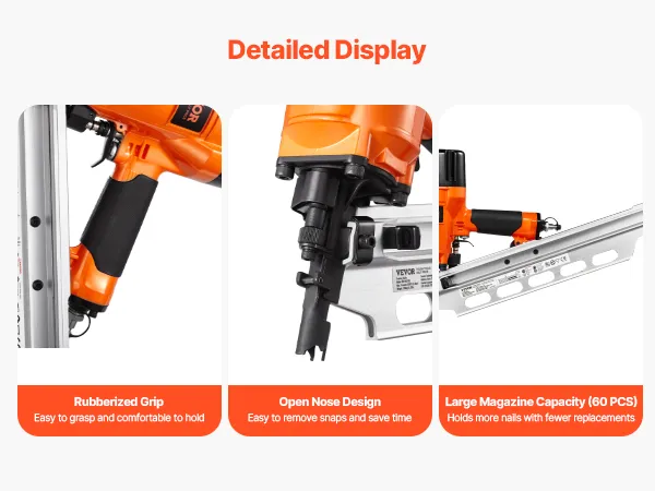 Breed scala aan toepassingen: onze 21° ronde kop-framespijkermachine werkt in een drukbereik van 80 tot 120 PSI, is voorzien van een cilinderklepaandrijfsysteem voor een snelle reactie en gebruikt perslucht als energiebron om een krachtige slagkracht te leveren. Het is perfect voor framebouw, houtskeletbouw, ondervloeren en daken - ideaal voor professionele en doe-het-zelfprojecten.