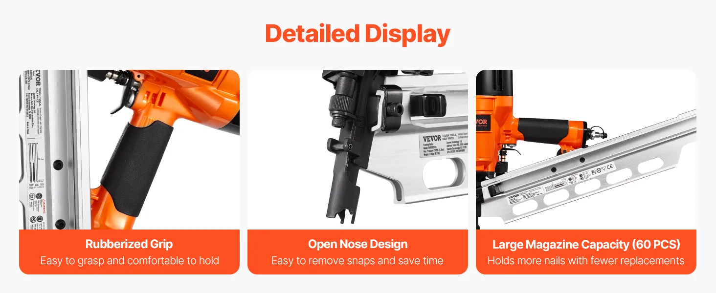 Geoptimaliseerd ontwerp: Deze professionele pneumatische spijkermachine heeft een open ontwerp, waardoor vastzittende spijkers snel en eenvoudig kunnen worden verwijderd. Dit bespaart tijd en verhoogt de werkefficiëntie; Het grote magazijn biedt plaats aan maximaal 60 nagels en zorgt ervoor dat u efficiënt kunt werken zonder dat u vaak hoeft te herladen. Het magazijn is gemaakt van hoogwaardig aluminium en garandeert een lange levensduur.