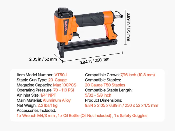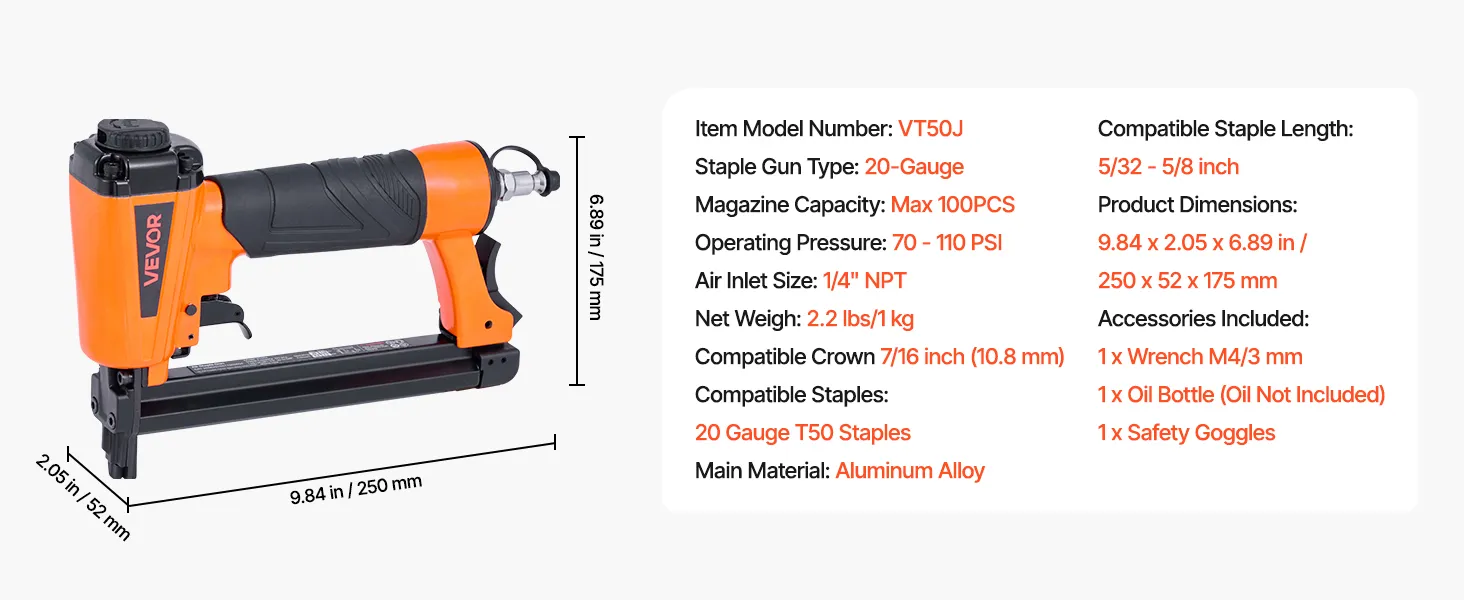 Compatibele nieten: Deze pneumatische spijkermachine is compatibel met 20-gauge T50 nieten met een kroonmaat van 7/16 inch (10,8 mm) en nietlengtes van 5/32 inch tot 5/8 inch (4 mm tot 16 mm). Bedrijfsdruk: 70-110 PSI, luchtinlaat: 1/4 inch NPT. Voor gebruik moet de machine worden aangesloten op een luchtcompressor (luchtcompressor niet inbegrepen).