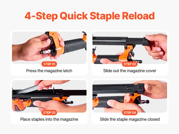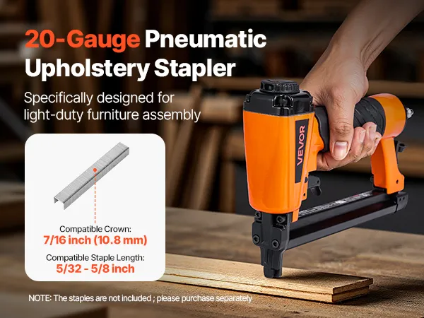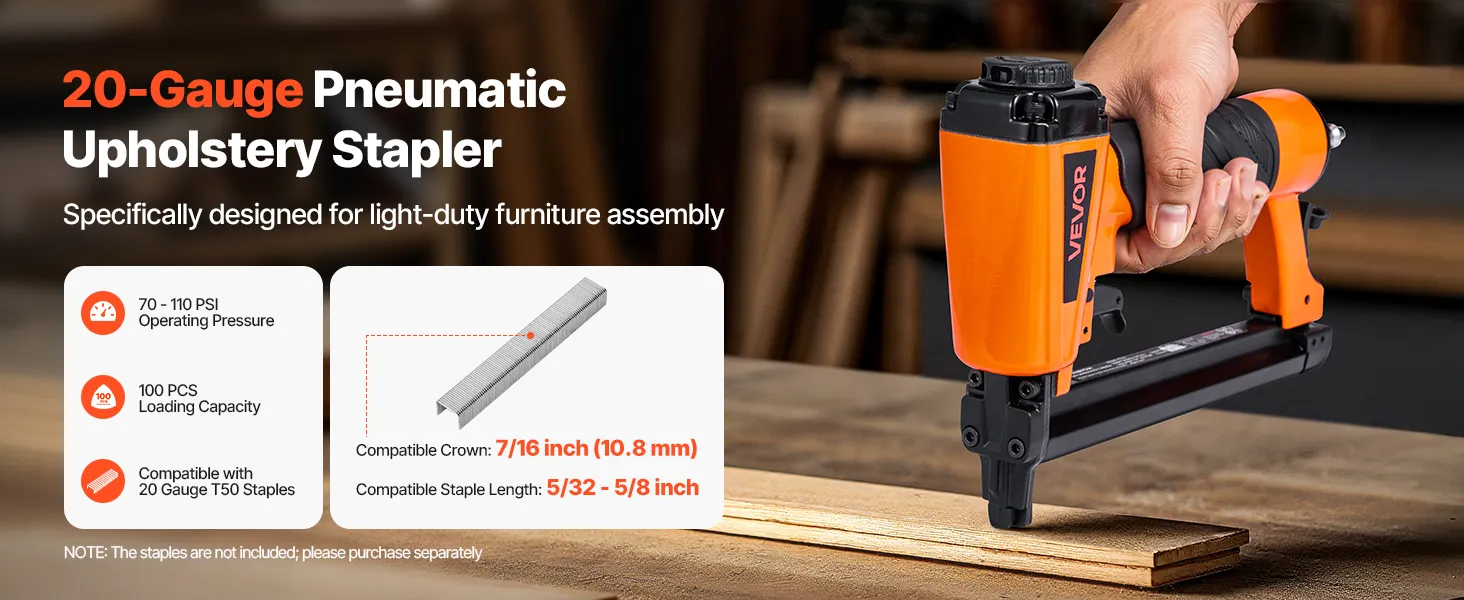 Deze pneumatische spijkermachine is compatibel met 20-gauge T50 nieten met een kroonmaat van 7/16 inch (10,8 mm) en nietlengtes van 5/32 inch tot 5/8 inch (4 mm - 16 mm). Het magazijn met hoge capaciteit kan tot 100 nieten tegelijk bevatten en is ideaal voor stoffering, timmerwerk, meubelconstructie en houtmontage.