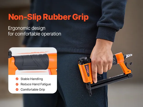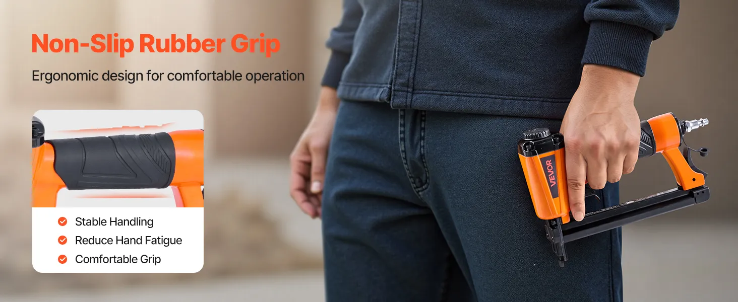Comfortabele grip: Deze lichte pneumatische nietmachine is uitgerust met een ergonomische, antislip rubberen handgreep en een lichtgewicht constructie. Hij biedt betere controle en een zachte en veilige grip, waardoor de hand minder snel vermoeid raakt bij langdurig gebruik.