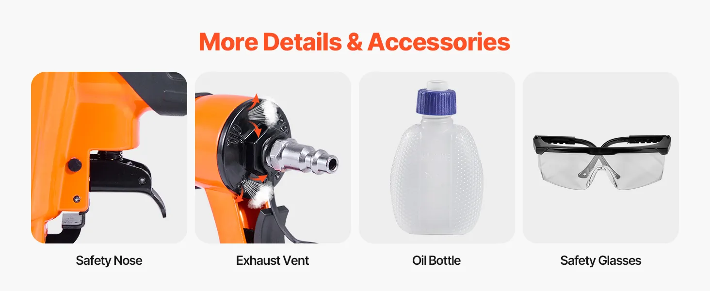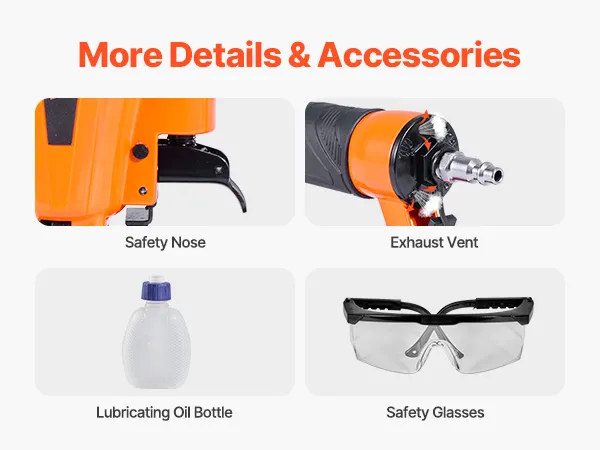 Ons pneumatische meubelstoffeerpistool is voorzien van een veiligheidstrekker om onbedoeld afblazen te voorkomen, een roterend uitlaatontwerp om de lucht van de gebruiker weg te leiden en een veiligheidsbril om uw ogen te beschermen tijdens het gebruik.