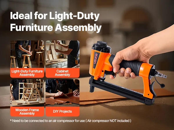 Geschikt voor stoffering, lichte meubelmontage, houtbewerking, kastmontage, lijsten maken, sierlijsten bevestigen, banken en stoelen maken en andere doe-het-zelfprojecten. Voor gebruik moet de machine worden aangesloten op een luchtcompressor (luchtcompressor niet inbegrepen).
