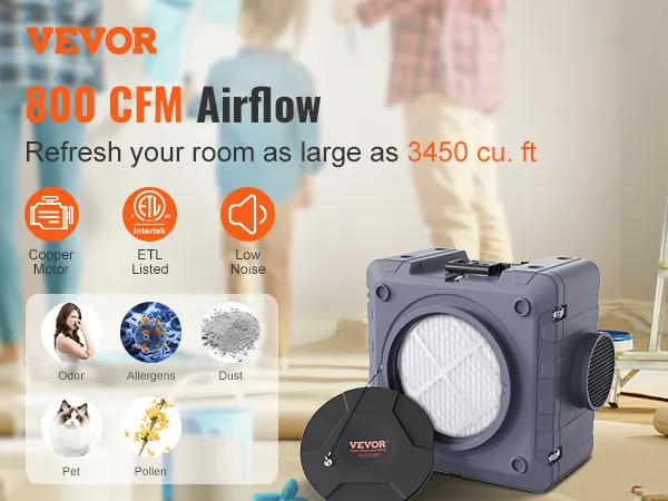 800 CFM luchtstroom: deze draagbare luchtreiniger beschikt over een zeer efficiënte koperen motor, die duurzamer en stabieler is. Met een inlaat van 39,4 cm en een uitlaat van 21,6 cm biedt deze luchtreiniger een optimale reiniging. Het beschikt over een filteroppervlak van 3.450 kubieke voet en een maximale luchtstroom van 800 CFM (instelbaar), waardoor de hele kamer profiteert van schonere lucht.