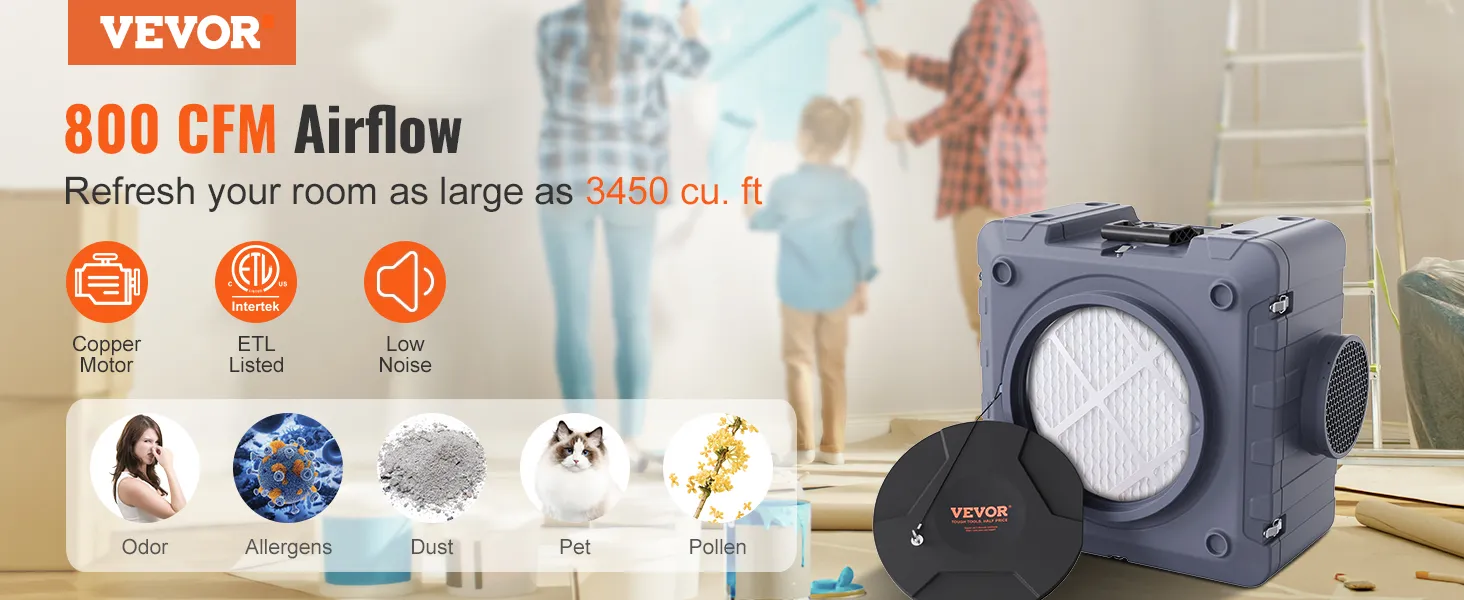 De luchtreiniger kan vervuilde lucht uit afgesloten ruimtes verwijderen en zo een veilige en schone omgeving creëren. Het is voorzien van kanalen en kan worden gebruikt als een negatieve luchtmachine.