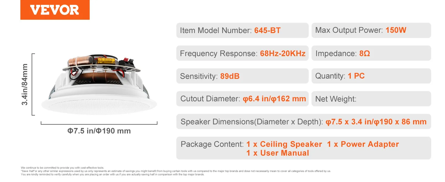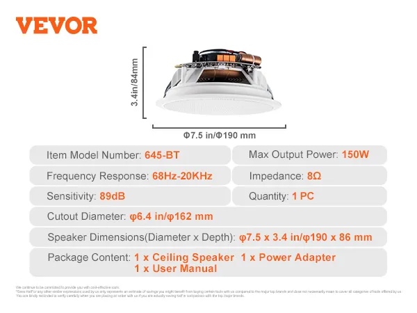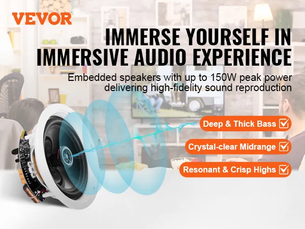 Elevate your audio experience to a new level! Featuring a 6.5'' woofer and 1'' tweeter, our 150W ceiling speaker delivers unparalleled sound quality and seamlessly integrates into your ceiling. The built-in Bluetooth chip enables wireless connectivity with various Bluetooth devices.