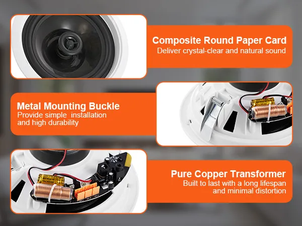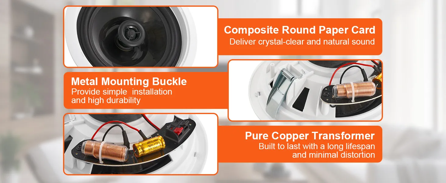 Equipped with a unique acoustic architecture, our ceiling mounted speaker ensures not only clear and natural sound quality but also stable and efficient current transmission. It significantly reduces distortion and interference, providing a pure, uninterrupted audio experience.