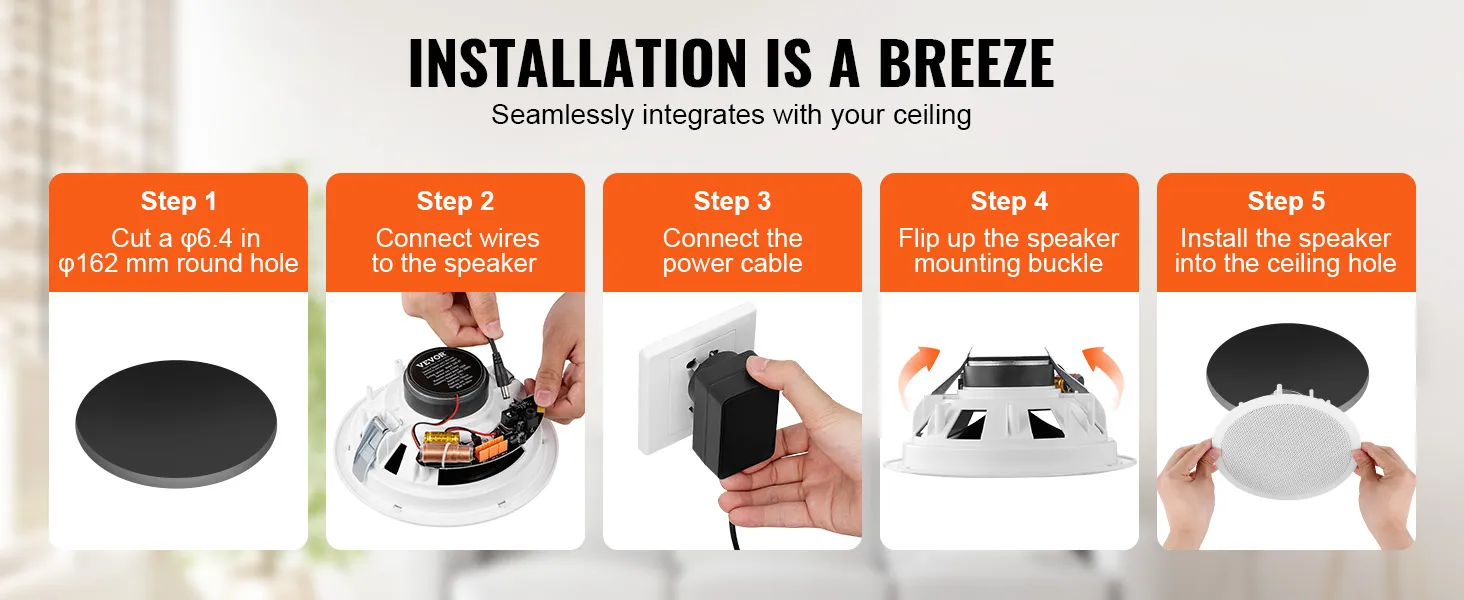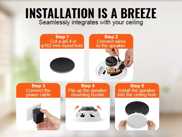Installation is a Breeze: Transform your space in no time! Just cut a φ6.4''(162 mm) hole in your ceiling, secure the speaker to the ceiling via the mounting buckle, and connect the power. For larger spaces, consider purchasing additional secondary speakers (up to 3 in series) for a layout to achieve greater sound coverage. Secondary speakers available in-store.