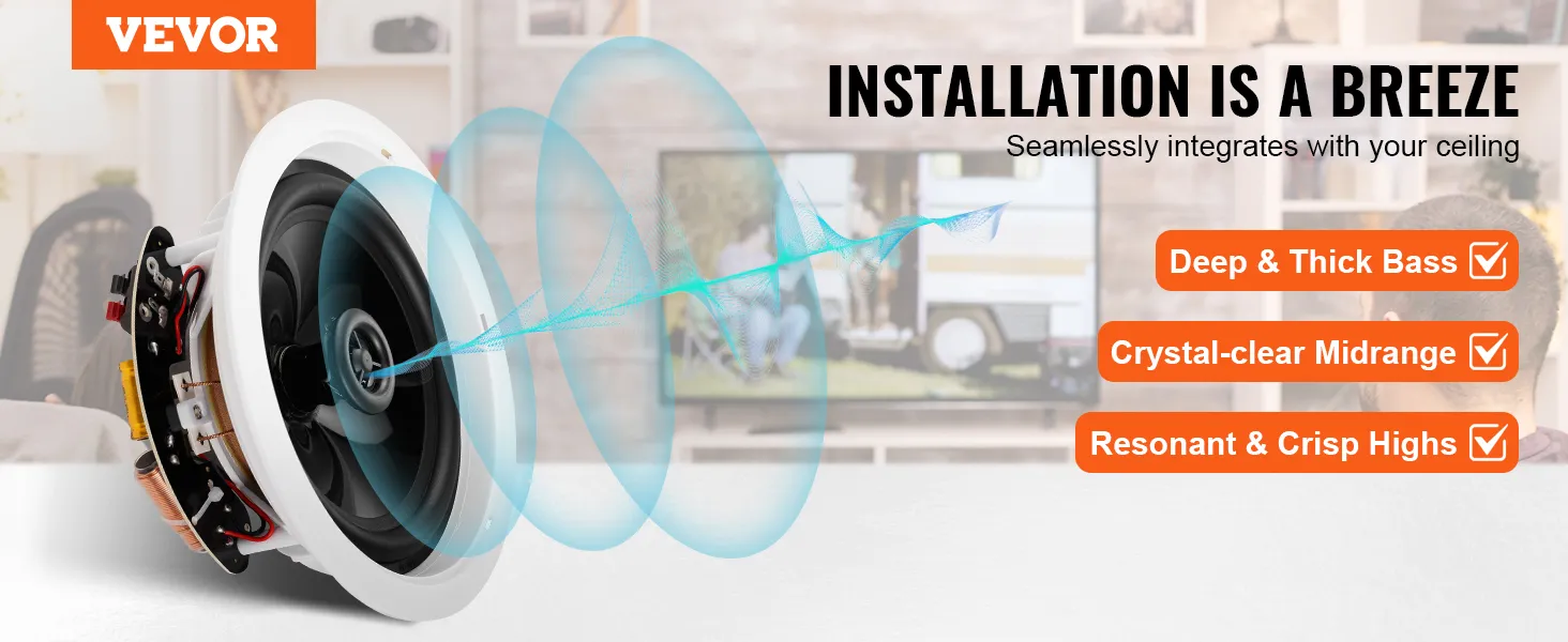 Unique Acoustic Architecture: Immerse yourself in stunning audio clarity with our ceiling mounted speaker. Equipped with a 6.5'' woofer and a 1'' tweeter, it delivers lifelike sound that brings your music and movies to life. The innovative rubber sealing strip and robust ABS housing avoid audio leakage, ensuring you experience every note in pure, high-fidelity brilliance.