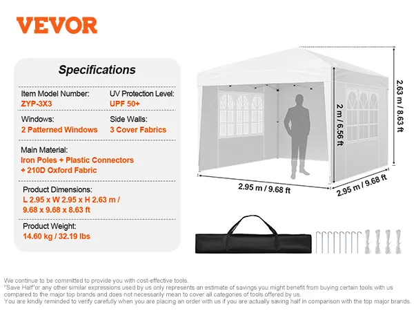 Exceptional Sun Protection: Crafted from 210D silver-coated Oxford fabric, this pop up gazebo provides UPF 50+ sun and water resistance, with added coverage to shield your family from the sun and light rain.