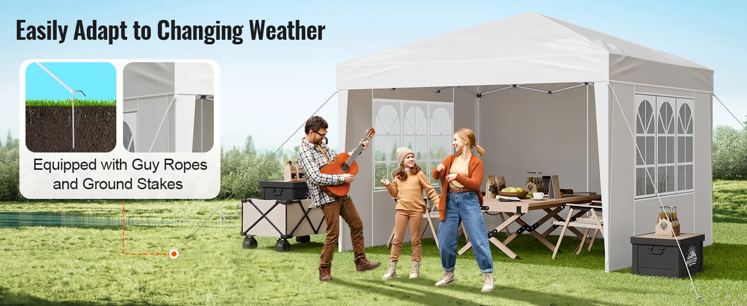 Designed to withstand sudden gusts and harsh weather, our pop up canopy comes equipped with wind ropes and ground stakes to enhance stability during windy conditions.