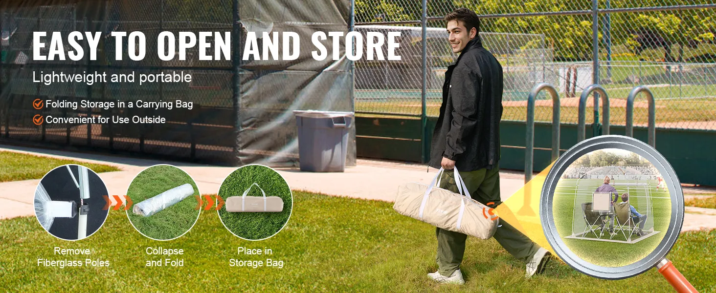 Eenvoudig op te zetten en gemakkelijk mee te nemen: geen ingewikkeld gereedschap nodig - deze sportregentent is binnen enkele minuten op te zetten met zijn eenvoudige glasvezelstokkensysteem. Hij is licht en compact en kan worden opgevouwen in de meegeleverde draagtas, zodat u hem gemakkelijk mee kunt nemen op uw buitenavonturen.