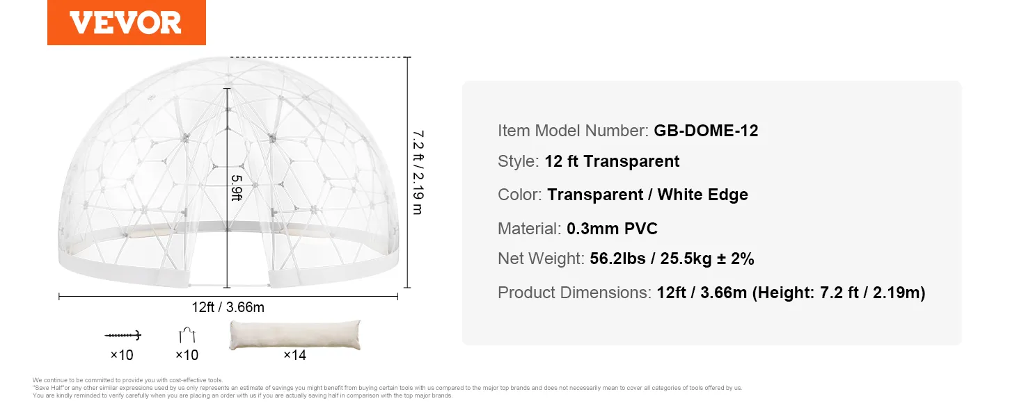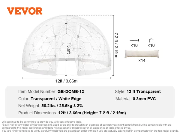 VEVOR Garden Dome Tent House, 12 FT Dome Tent, Upgraded Igloo Tent with PVC Transparent Cover and Window, Waterproof Outdoor Geodesic Dome Camping Shelter for Patio, Dining Backyard, Party