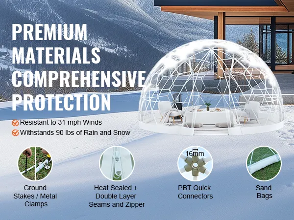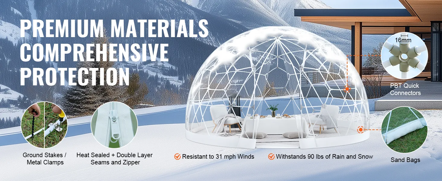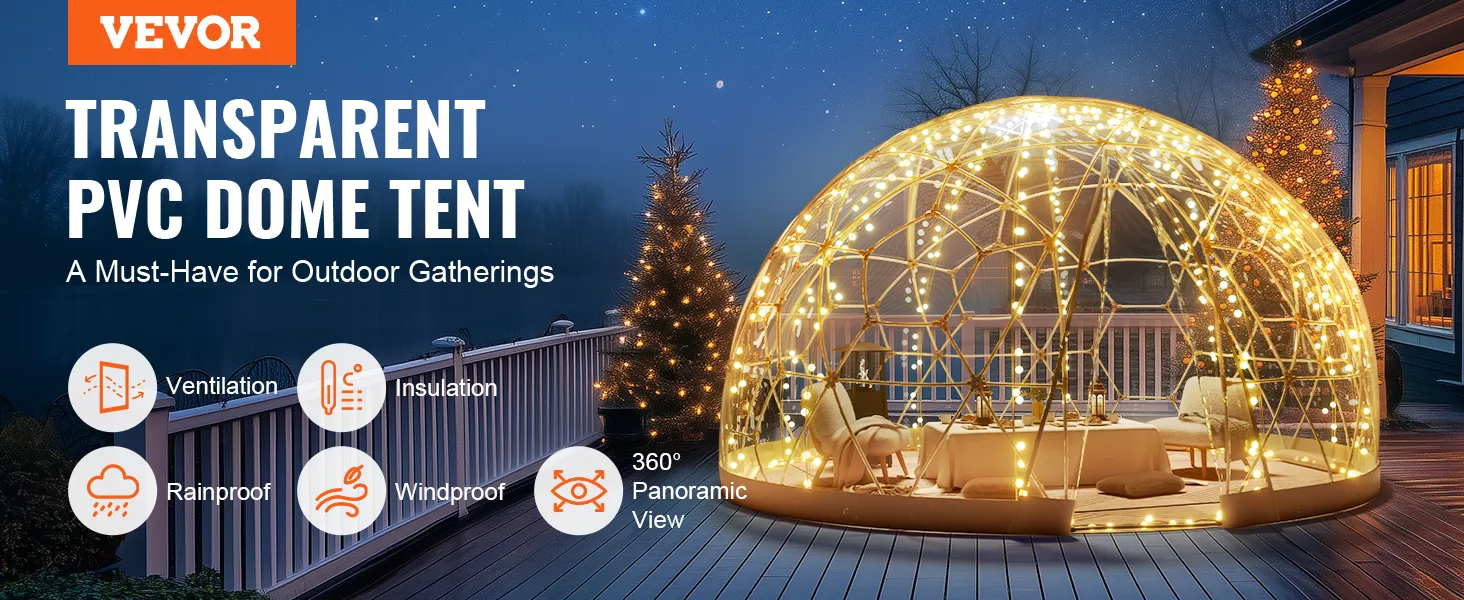 Crafted from PVC material, this tent features a convenient zipper door and ventilation windows, ensuring comfortable airflow. Enjoy year-round scenery under the dome with excellent insulation keeping you warm.
