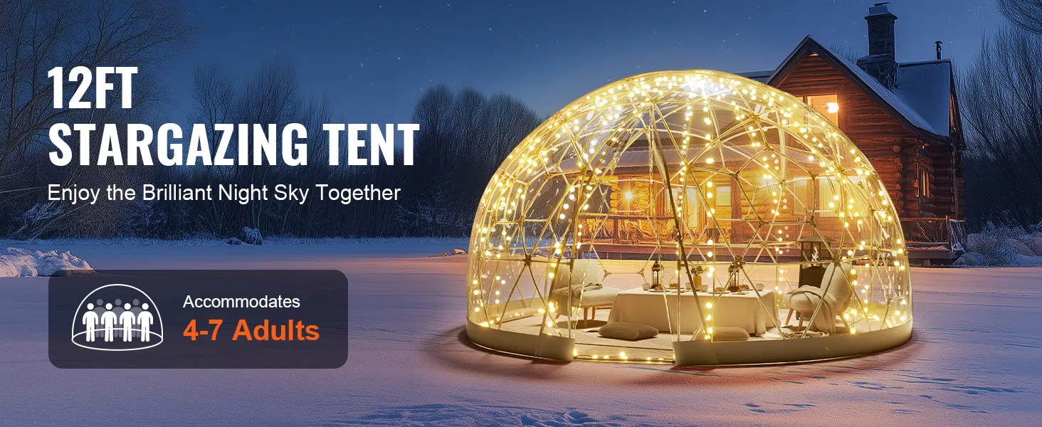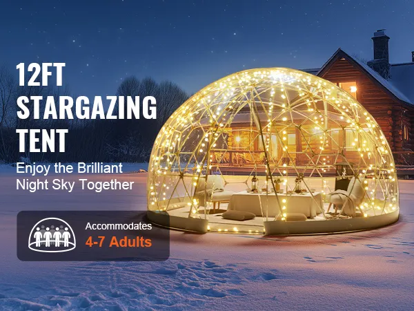 Adequate Capacity: With a diameter of 12 ft and a maximum height of 7.2 ft, this dome igloo tent accommodates 4-7 adults. Its ample space allows for various patio furniture and creates a warm, dreamlike world. The high tent design ensures unobstructed standing and walking, maintaining comfort and privacy even for gatherings. Transform into an open-air stargazing platform under the night sky with friends and family.