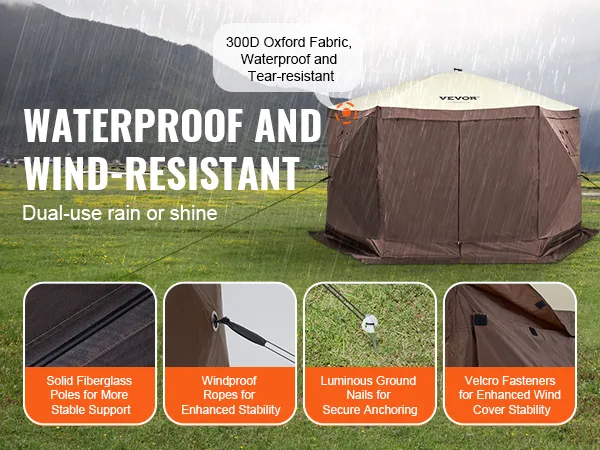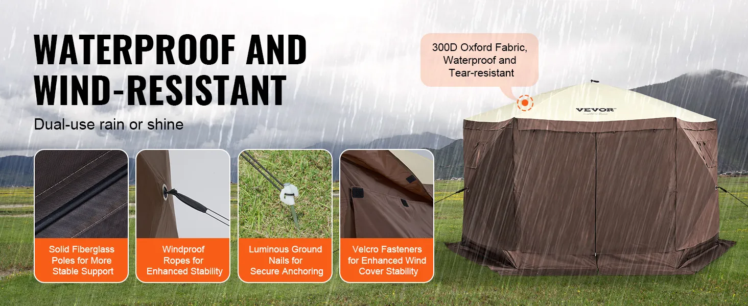 The pop up camping gazebo made of upgraded thickened waterproof materials prevent leakage and ensure stability outdoors.