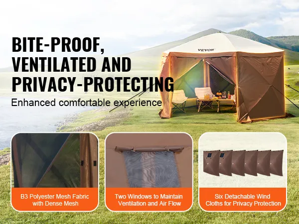 6 Windproof Cloths: The camping gazebo comes with 6 detachable and installable windproof cloths, providing you with a secluded private space outdoors. Two of the windproof cloths have windows to ensure air circulation and provide a comfortable user experience.