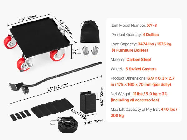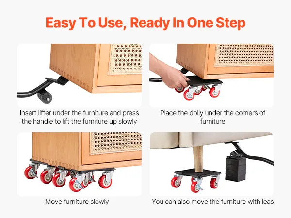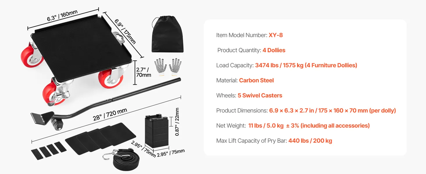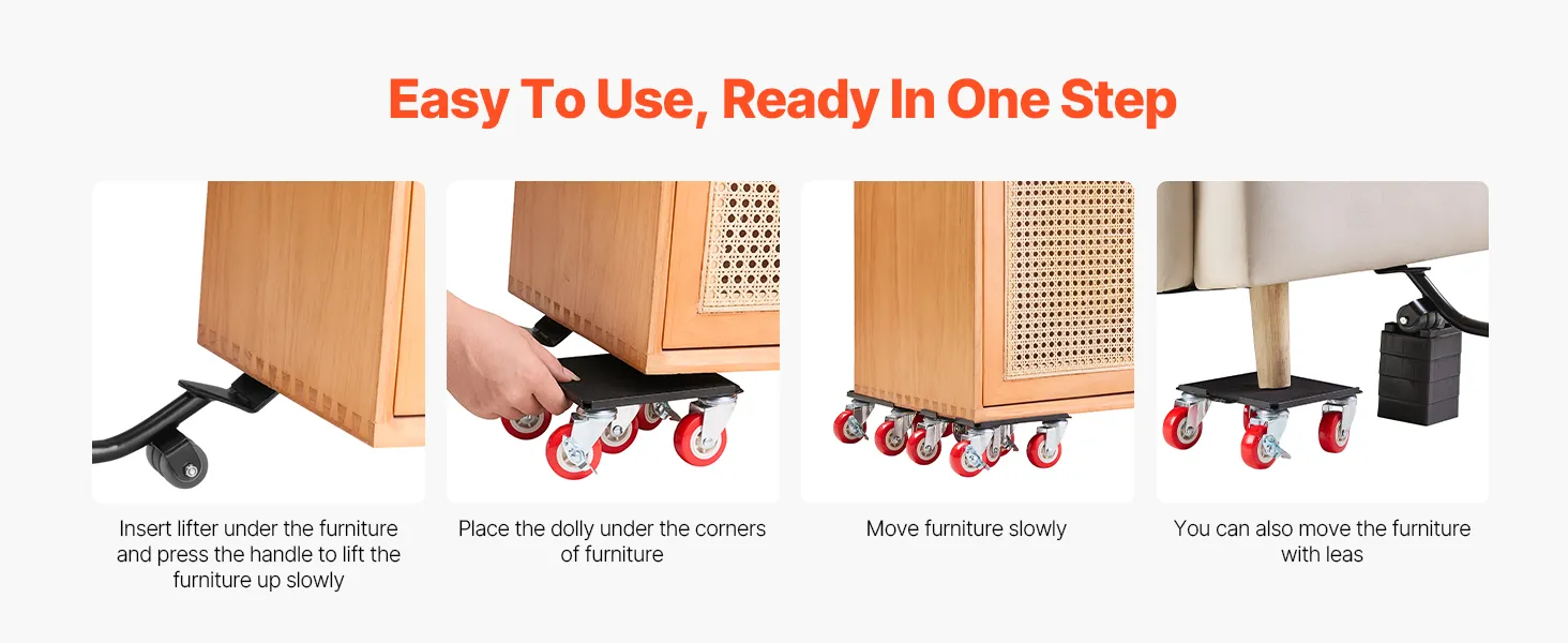 Simple and Easy to Use: A pry bar is included to assist in moving, and you can easily lift or shift furniture. Simply place the dolly under the item after leveraging it up, repeat for all corners, and then push steadily for effortless transport.