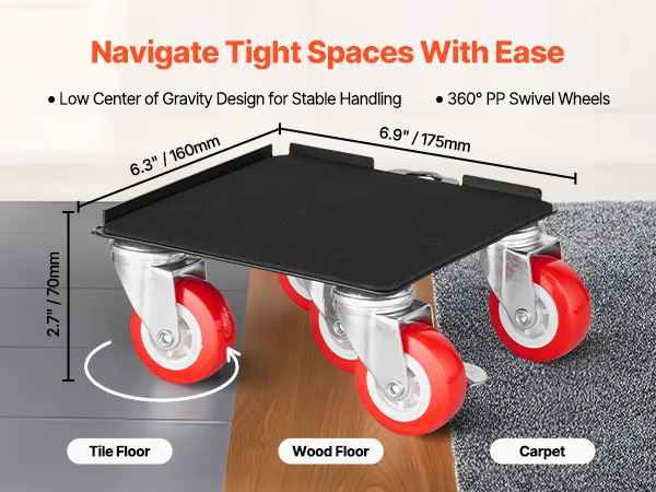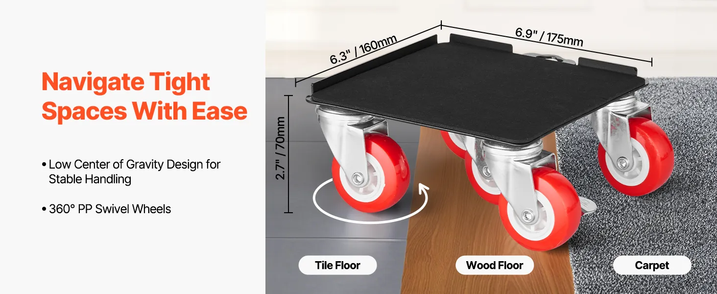 Ultra-Strong Load Capacity: Utilizing all four furniture dollies together, you get a remarkable 3474 lbs load capacity. Made from high-strength carbon steel, the sturdy structure of our furniture mover ensures reliable stability when moving heavy items like sofas and refrigerators. Designed for long-term use without deformation, the furniture movers for heavy furniture are ideal for home moves, deep cleaning, and warehouse organization.