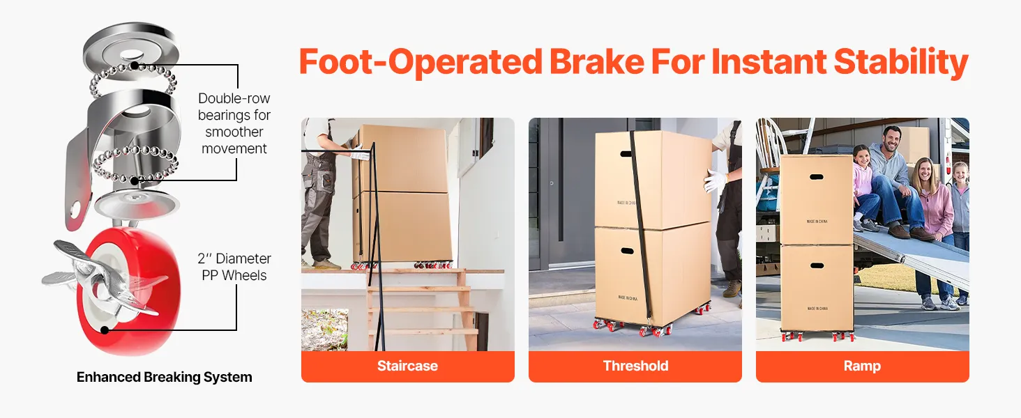 One-Click Braking: Equipped with dual brakes, a simple push locks the heavy duty furniture dolly in place, avoiding unintended movement. This ensures security during transport and while parked, allowing you to temporarily set down furniture to open doors or retrieve other items.