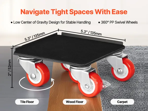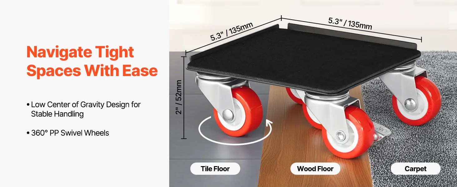 Our furniture movers with wheels are widely applicable. Its 360° swivel wheels combined with a 52 mm low center of gravity design allow for easy navigation of all types of furniture, regardless of size or height, through complex home environments.