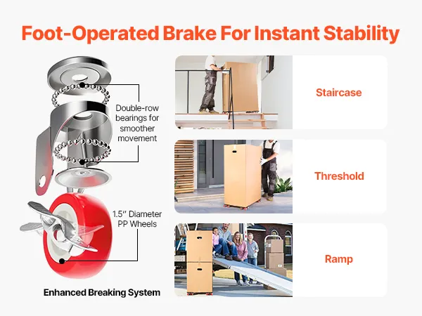 One-Click Braking: Equipped with dual brakes, a simple push locks the heavy duty furniture dolly in place, avoiding unintended movement. This ensures security during transport and while parked, allowing you to temporarily set down furniture to open doors or retrieve other items.