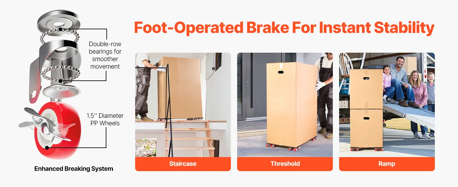 At any stopping point, such as staircases or narrow corridors, the one-click brake of the furniture dolly ensures security during use by allowing for quick and secure halting of movement.