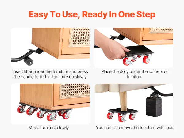 Simple and Easy to Use: A pry bar is included to assist in moving, and you can easily lift or shift furniture. Simply place the dolly under the item after leveraging it up, repeat for all corners, and then push steadily for effortless transport.