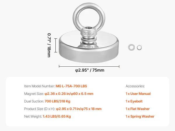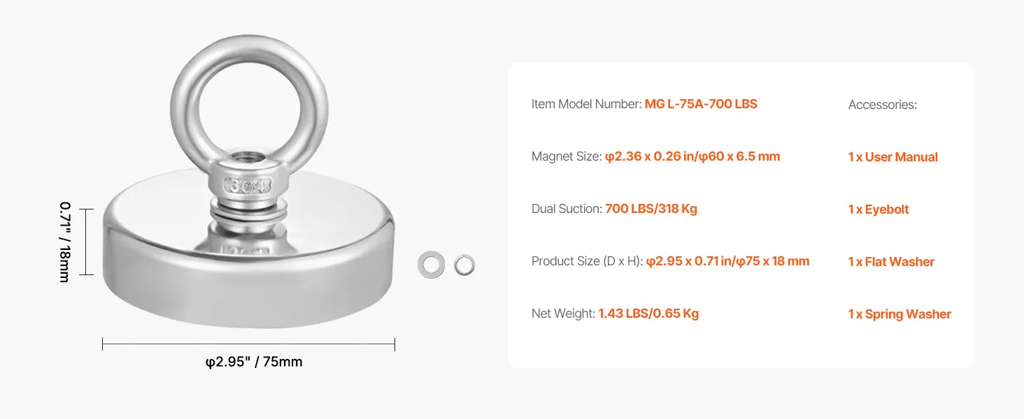 Draagbaar en praktisch: ontworpen voor draagbaarheid, deze vismagneet heeft compacte afmetingen van φ2,95 x 0,71 inch / 75 x 18 mm en weegt slechts 1,43 lbs / 0,65 kg. Hij is gemakkelijk mee te nemen en past in uw zak, zodat u altijd en overal kunt vissen.