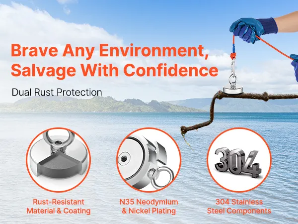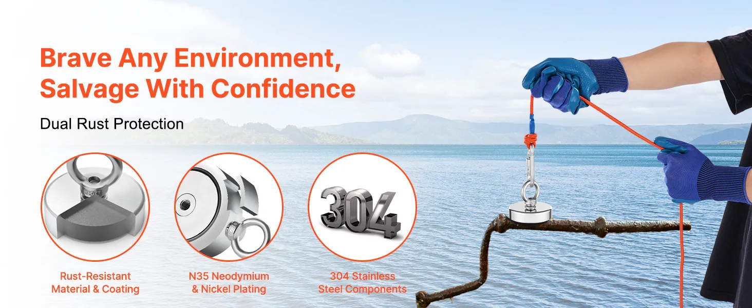 Efficiënte ervaring: deze krachtige magneet maakt gebruik van N35 zeldzame-aarde-neodymiummagneten en biedt een trekkracht van 318 kg (700 lbs), waardoor metalen voorwerpen gemakkelijk kunnen worden geborgen, zelfs in complexe of moeilijk zichtbare onderwateromgevingen.